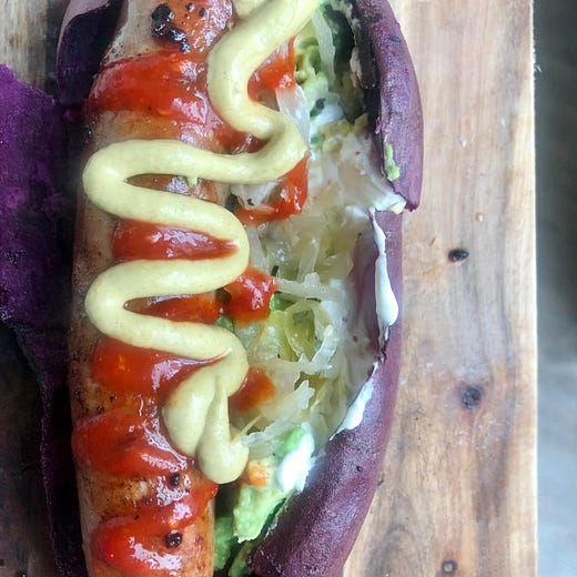 Starchy roots like potatoes and sweet potatoes must have their place in the pantry. As do onions. My Twitter pal, Case Bradford, is a master of the creative use of the purple sweet potato as a bun for bratwurst. It’s actually surprisingly good, and incredibly nutrient dense.