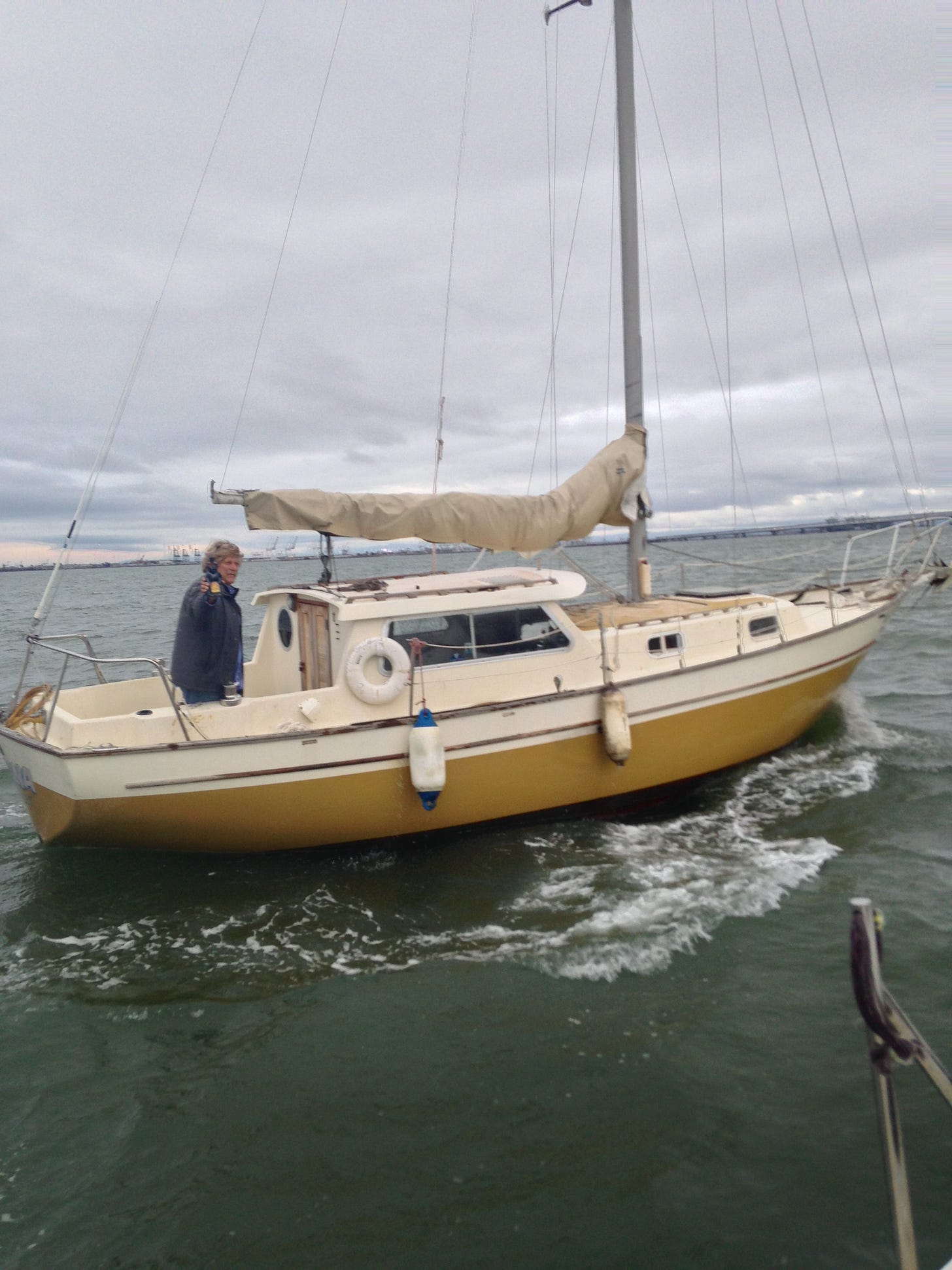 On my first real voyage out of the marina into those shallow depths off Berkeley’s shore, I promptly ran aground at the entrance to Clipper Cove at Treasure Island. A friend who was riding alongside me pulled me off the mud (thanks, John) and we rafted up overnight with the Washed Up Yacht Club. It was my first night trying to sleep without blankets, but I survived.